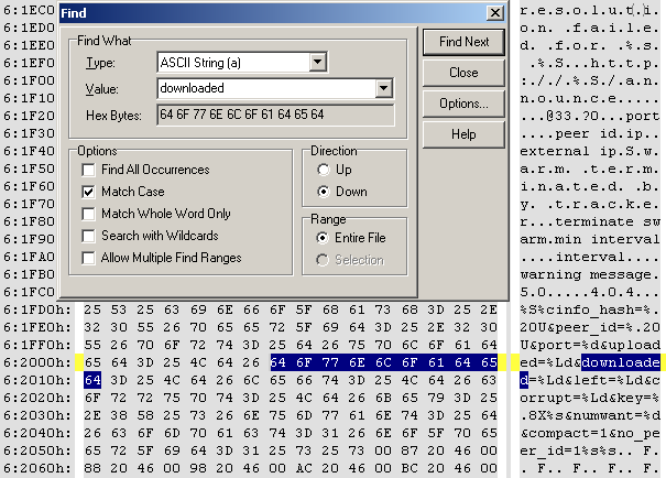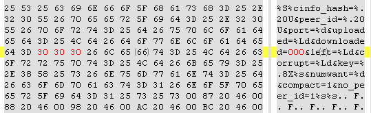 Теперь читаем спецификацию торрент протокола, и видим, что к трекеру идёт GET запрос, кроме прочего, содержит такие параметры, как downloaded и uploaded. Открываем hex редактор(мне больше нравится 010 Editor), загоняем туда utorrent.exe, и делаем поиск по слову downloaded. Находим что-то похожее на GET запрос: