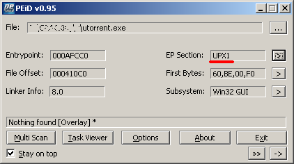 Далее, открываем PEiD, загоняем туда наш клиент, utorrent.exe, чтобы узнать, запакован ли он, и если да, то чем.